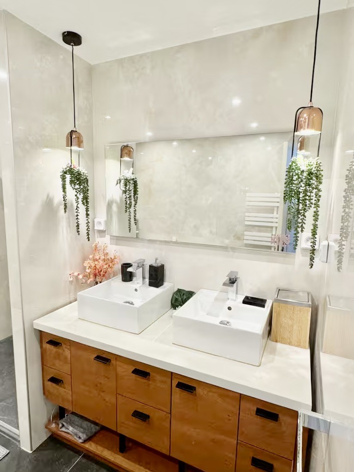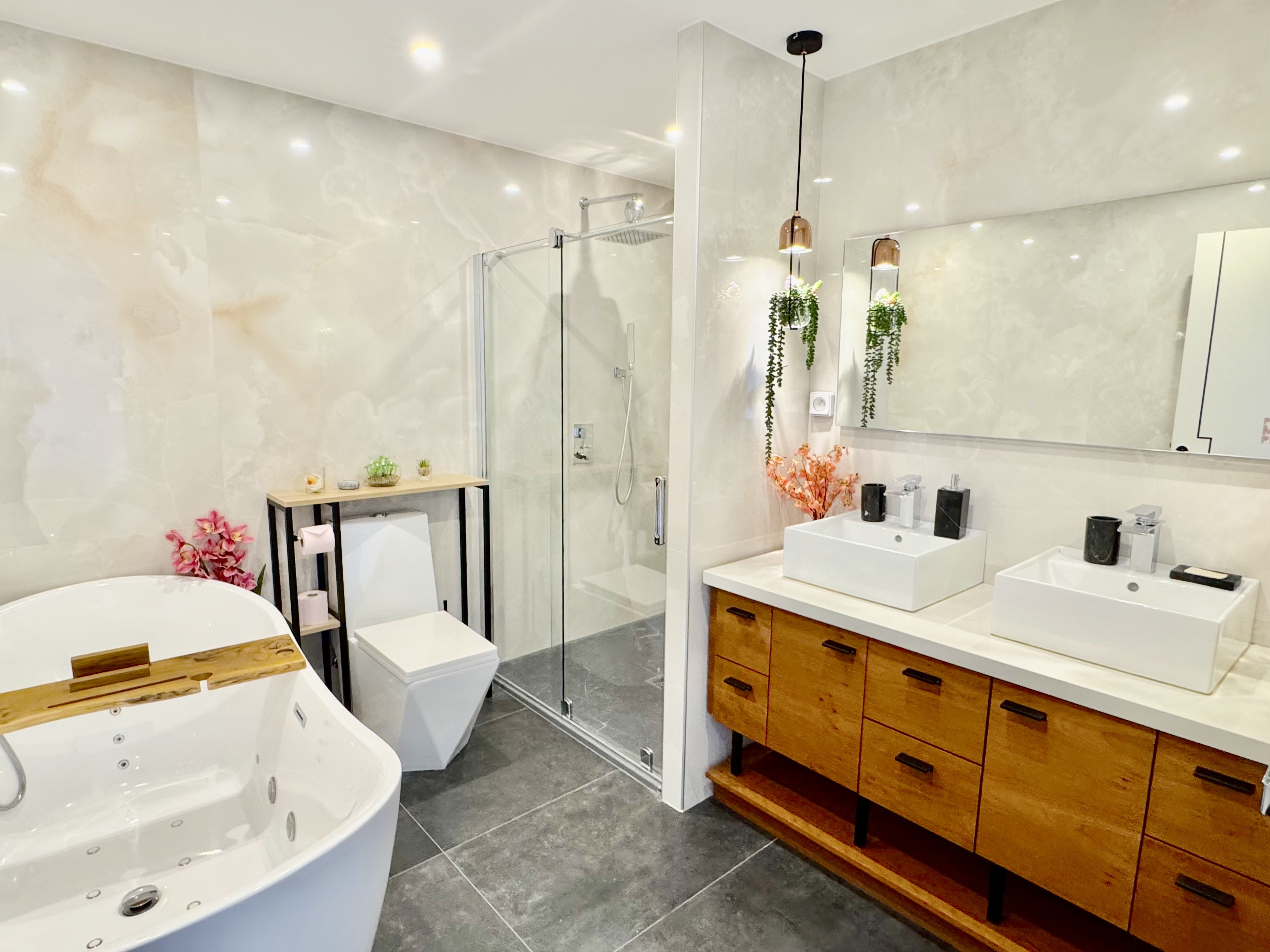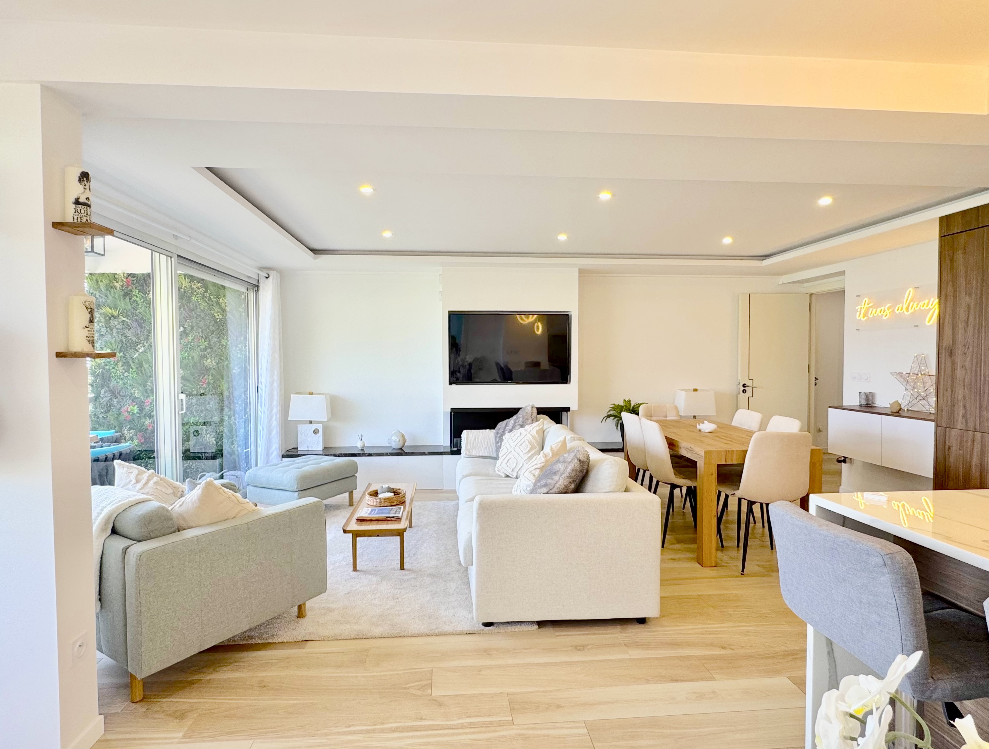 L'appartement est composé : d'une entrée, d'un vaste séjour salon/salle à manger, d'une cuisine américaine équipée, d'une chambre de maître avec salle de bains et WC privatifs, de deux chambres, d'une salle de bains et d'un WC indépendant.